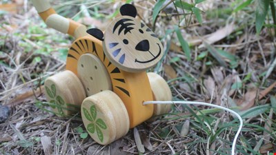 The Nicko Pull-Along Tiger Jingle Roller wooden baby toy is made from sustainable eco-friendly bamboo, designed and tested for babies.